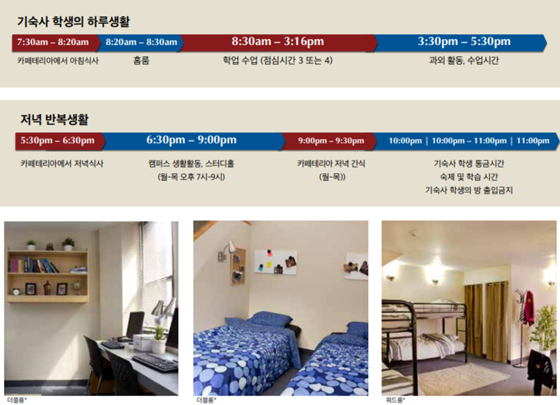 ☑ 또한 카페테리아는 연중 무휴로 운영되어 학생들은 월요일부터 금요일까지 아침, 점심, 저녁식사를 할수있고, 월요일 부터 목요일까지 저녁 간식이 제공됩니다. 주말과 공휴일에는 브런치와 저녁이 제공됩니다.