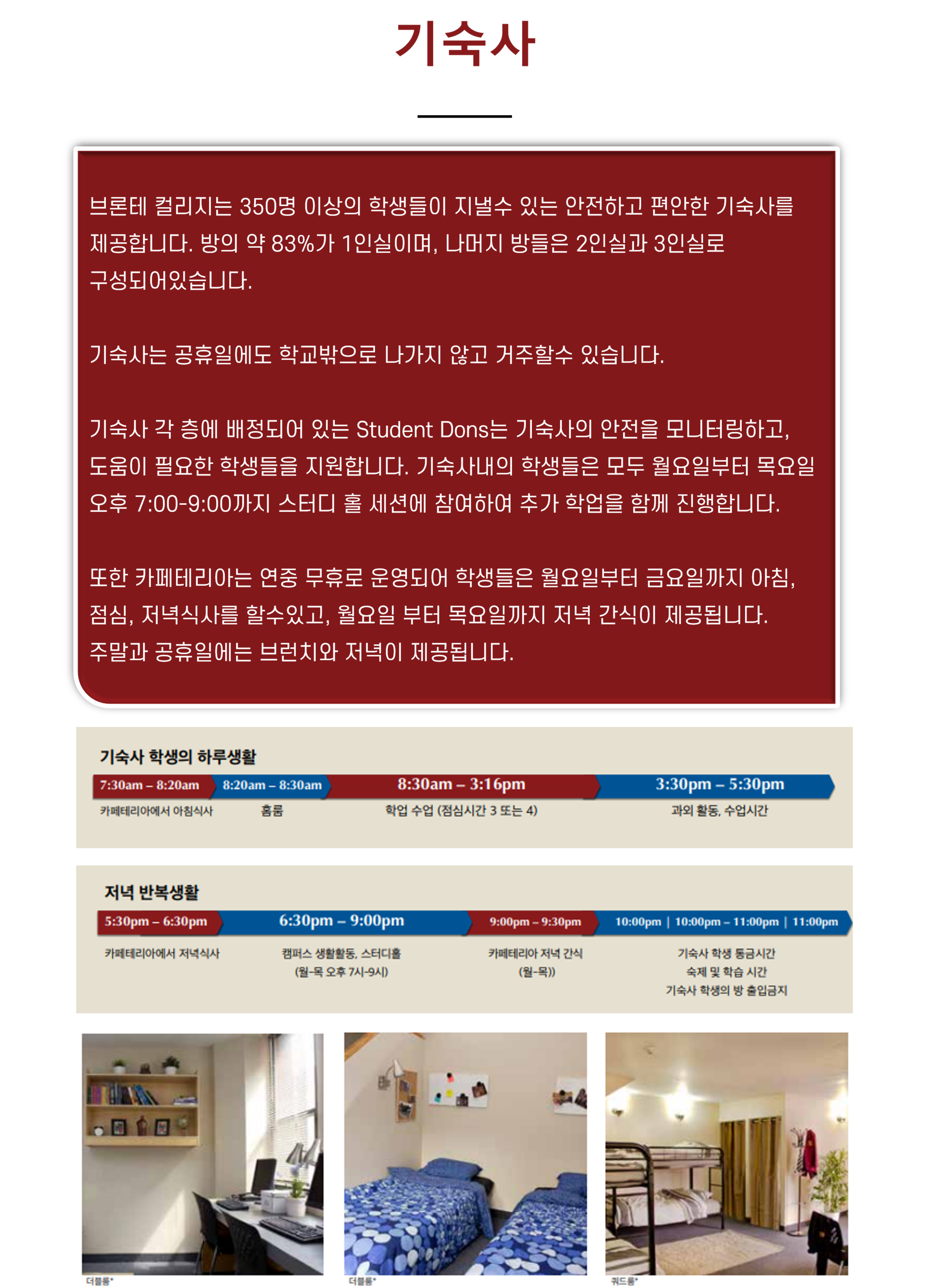 ☑ 브론테 컬리지는 350명 이상의 학생들이 지낼수 있는 안전하고 편안한 기숙사를 제공합니다. 방의 약 83%가 1인실이며, 나머지 방들은 2인실과 3인실로 구성되어있습니다.