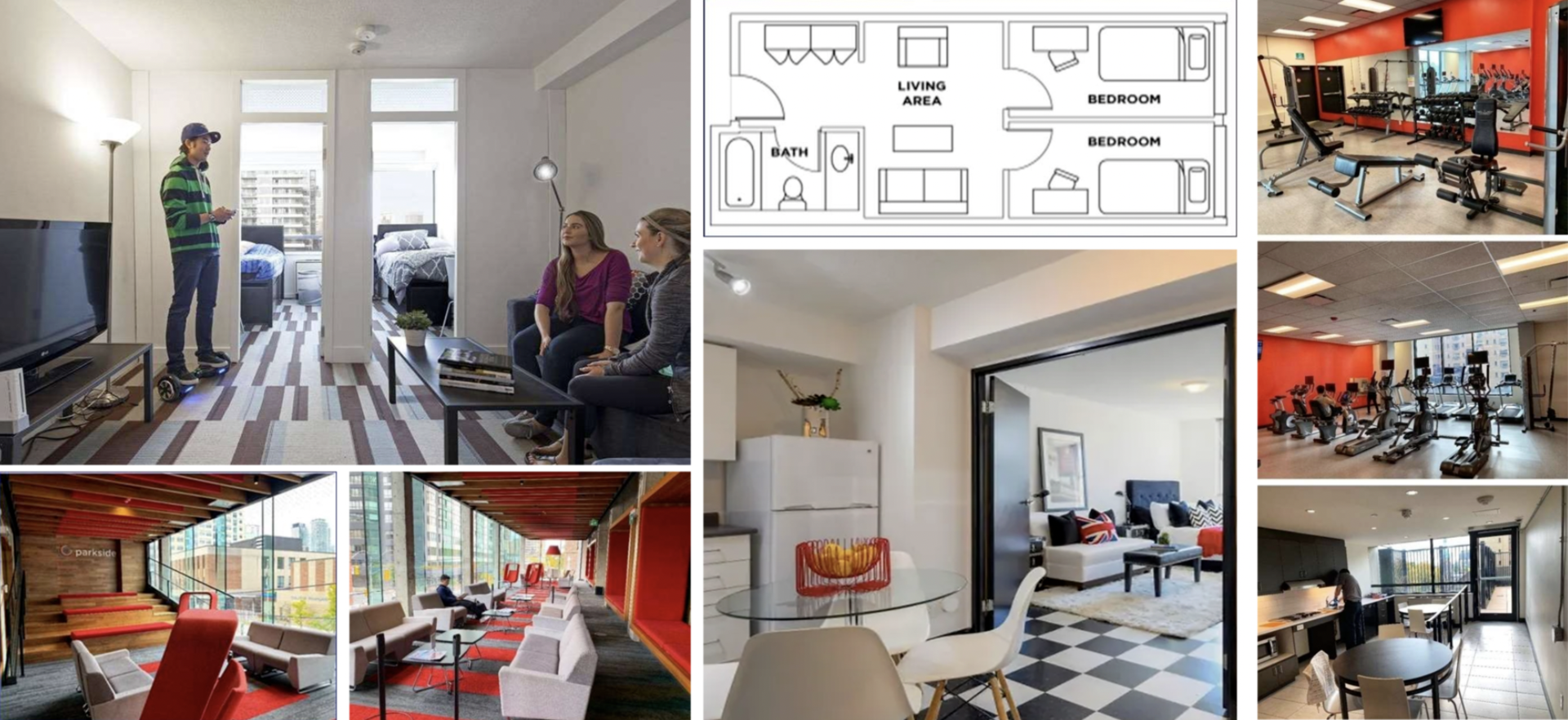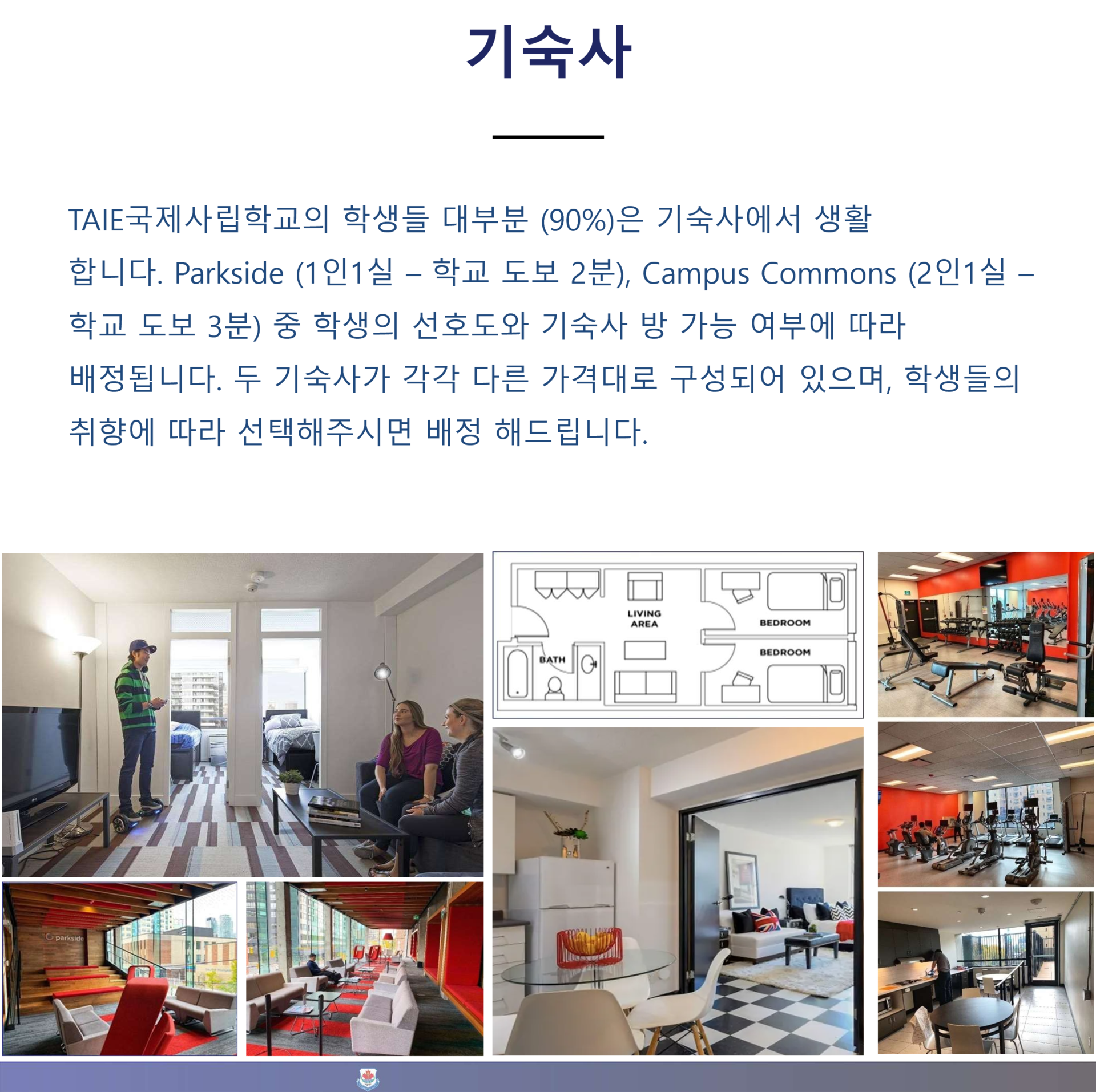 Parkside (1인1실 – 학교 도보 2분), Campus Commons (2인1실 – 학교 도보 3분) 중 학생의 선호도와 기숙사 방 가능 여부에 따라 배정됩니다.